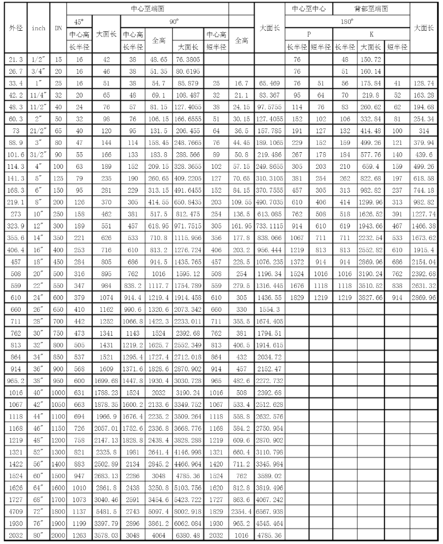 ASME16.28、ASME16.9 弯头标准数据