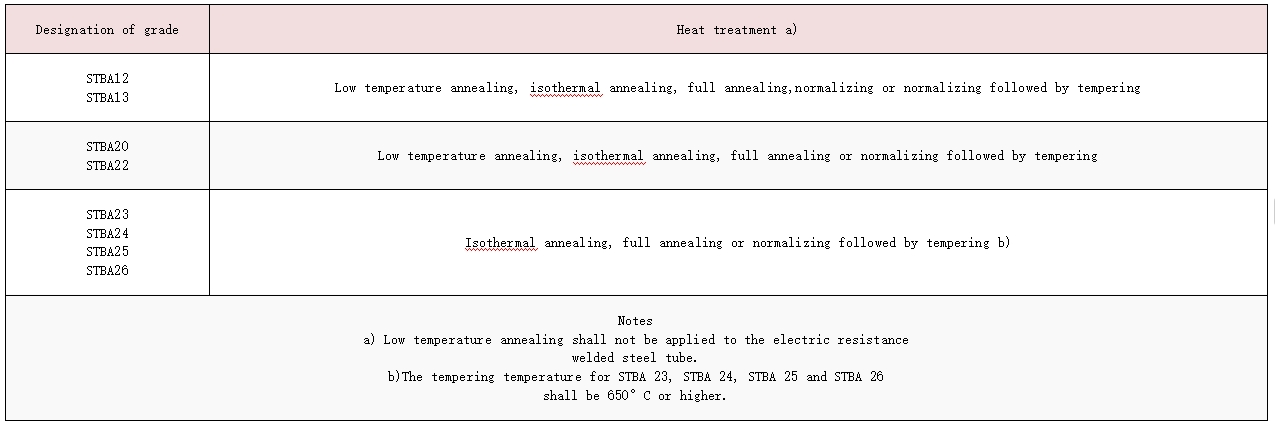 (c)Tubes shall be subjected to the Heat treatment specified in table 22.Other heat treatments not specified in table 2 shall be agreed between the purchaser and the manufacturer. - 管子应进行表22中规定的热处理。表2中未规定的其他热处理应由买方和制造商商定。