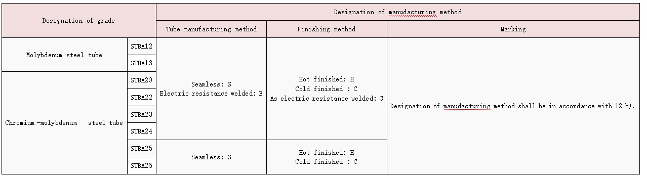 Tubes shall be classified into grades, and the designation of grade and designation of manufacturing method shall be as given in table 1