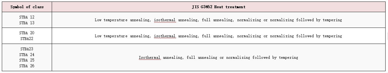 JIS G3462 specifies the alloy boiler steel tubes used for exchanging heat on the inside and outside of the tube, with 8 steel grades from STBA12-STBA26, it has the similar application as JIS G3461, steel tube of this specification could be supplied as U tube. However, it is not applicable to the steel tubes for heating furnace and those for heat exchangers of low temperature service. For final product, heat treatment of the bent portion is not usually performed.