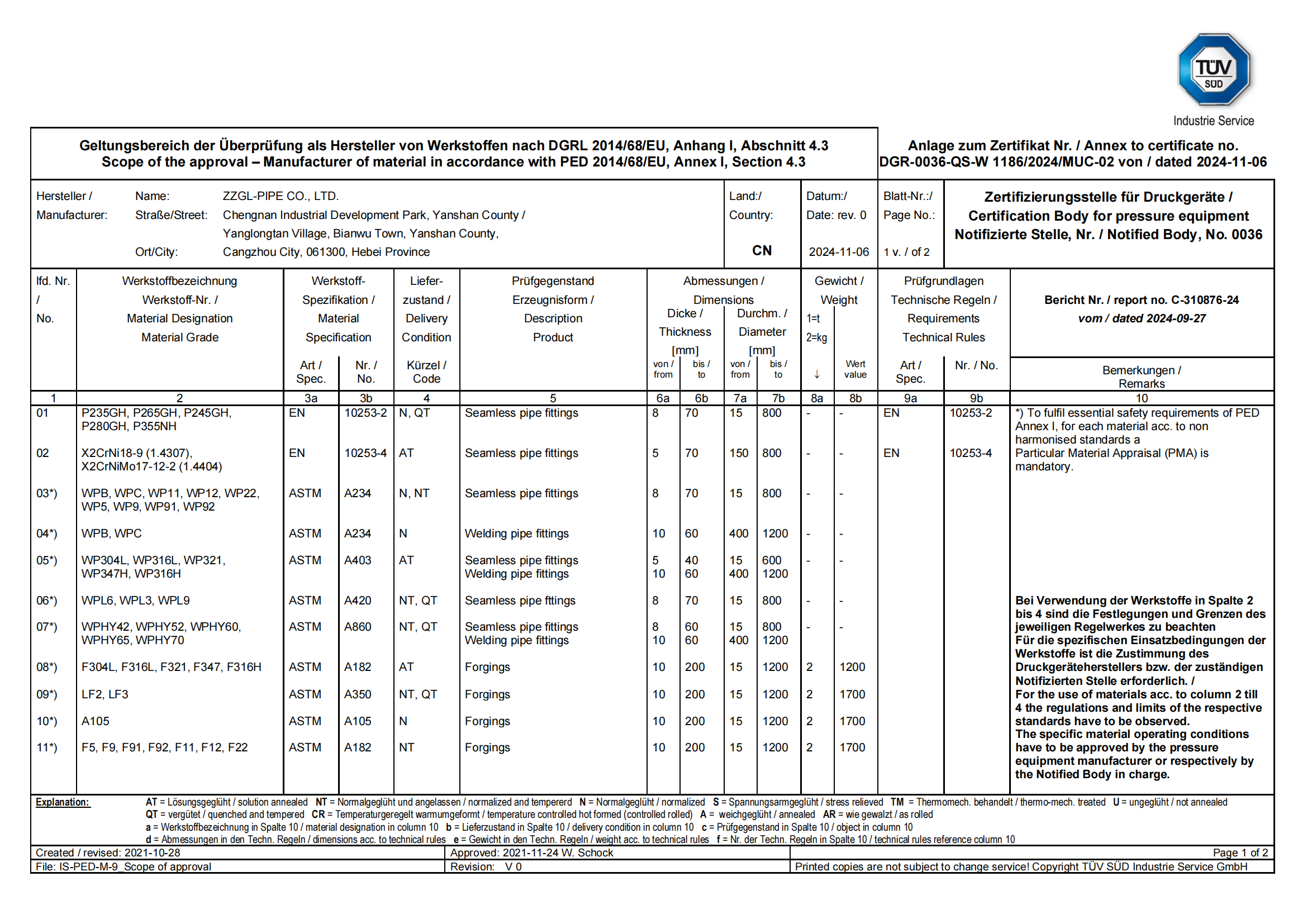 根据TUV作为EN 10253-2 P235GH-Seamless pipe fittings材料制造商的审核范围,符合PED 2014/68/EU Annex l, Section 4.3:资质认证详看下方认证证书