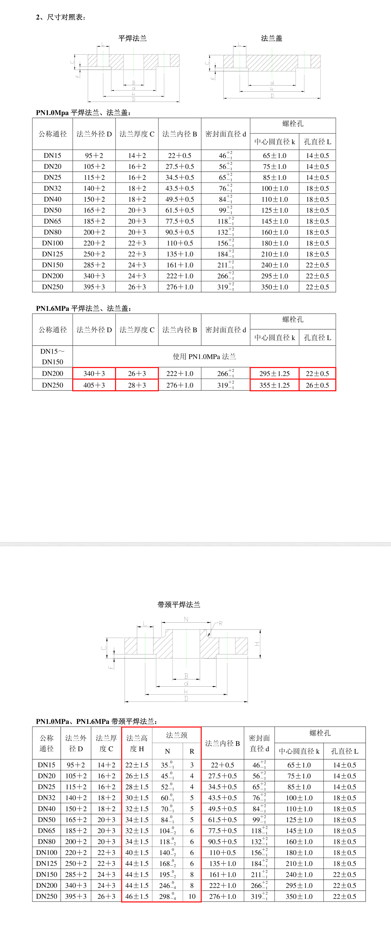 PN1.0 PN1.6 平焊法兰、盲板、带颈对焊法兰尺寸对应表图: