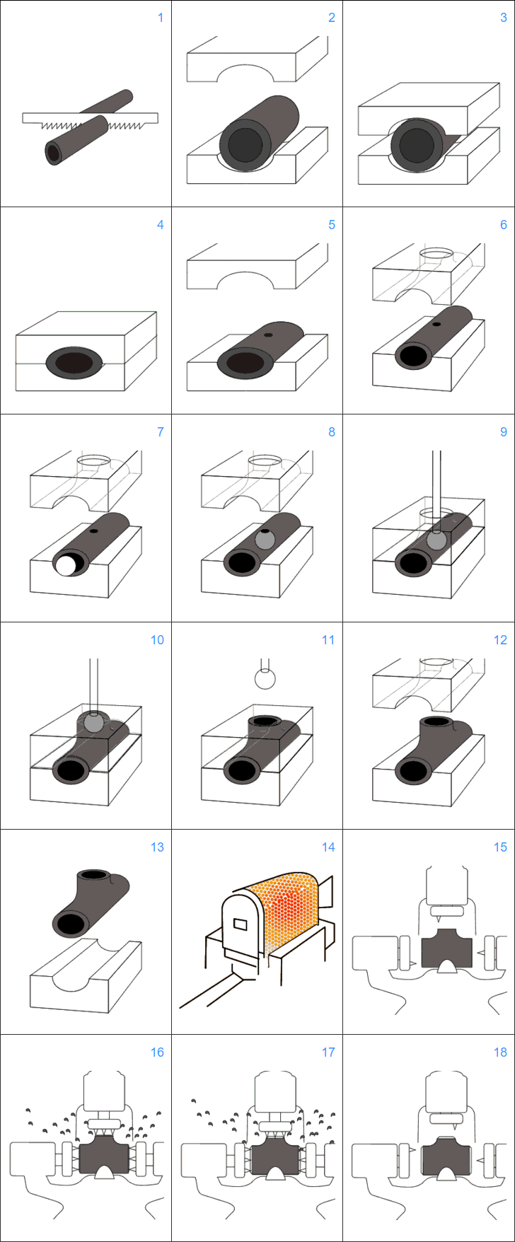 原材料进厂→切割成坯料→压扁至尺寸要求→加热起凸开孔→热挤成型→热处理→机加工坡口→表面处理→成品检验→标识保护→入库存放