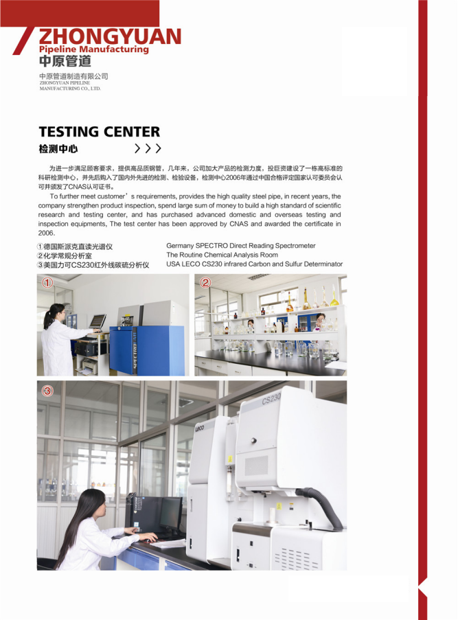为进一步满足顺客要求,提供高品质钢管,几年来,公司加大色虎视频污下载的检测力度,投巨资建设了一栋高标准的科研检测中心,并先后购入了国内外先进的检测、检验设备,检测中心2006年通过中国合格评定国家认可委员会认可并颁发了CNAS认可证书。