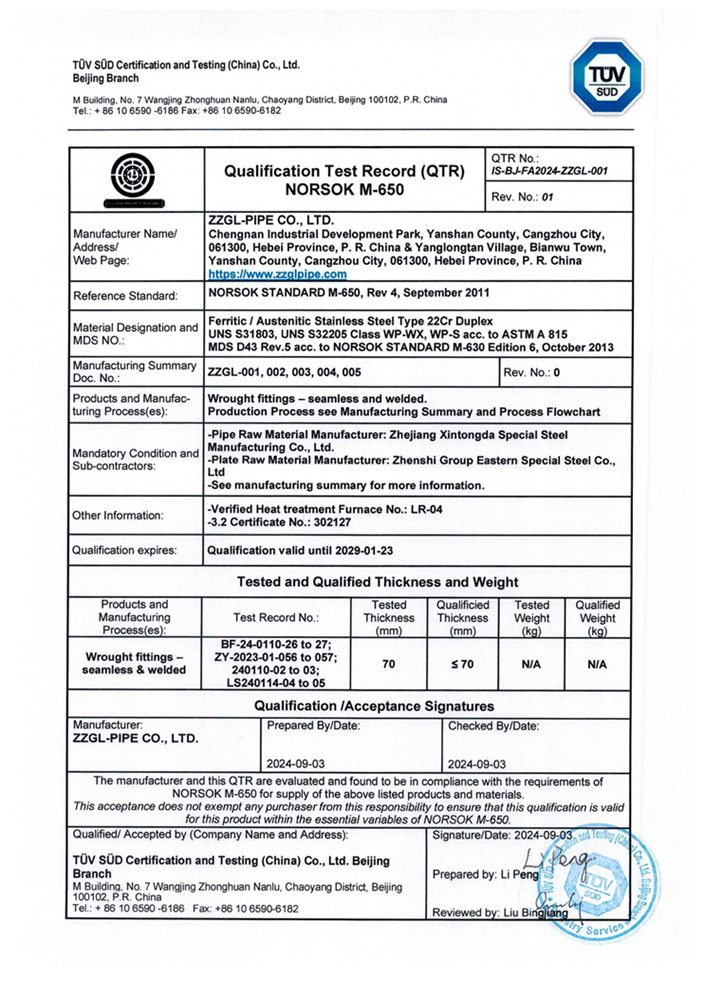 公司已通过挪威国家石油标准NORSOK M-650 ASTM A815 UNS S31803 S32205认证。