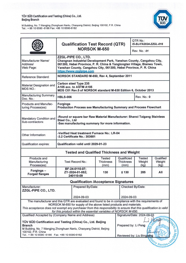 公司已通过挪威国家石油标准NORSOK M-650 ASTM A105 认证。